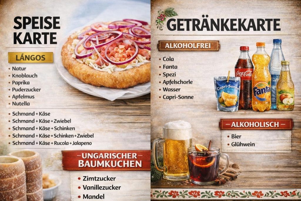 Unsere Spezialitäten: Frisch frittierte Langos und original ungarischer Baumkuchen, direkt vor Ort für euch zubereitet.