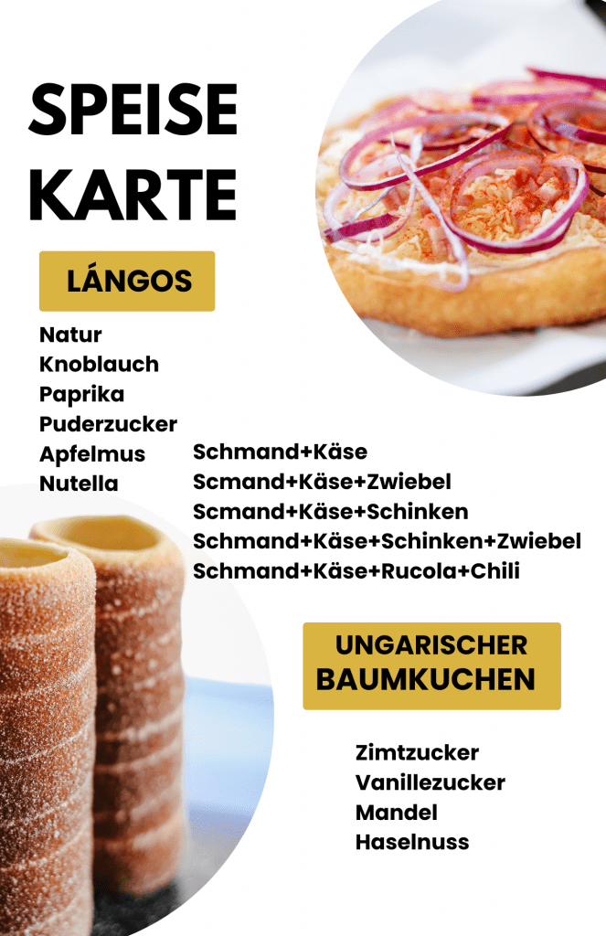 Unsere Speisekarte bietet eine feine Auswahl rund um Langos und ungarischen Baumkuchen.